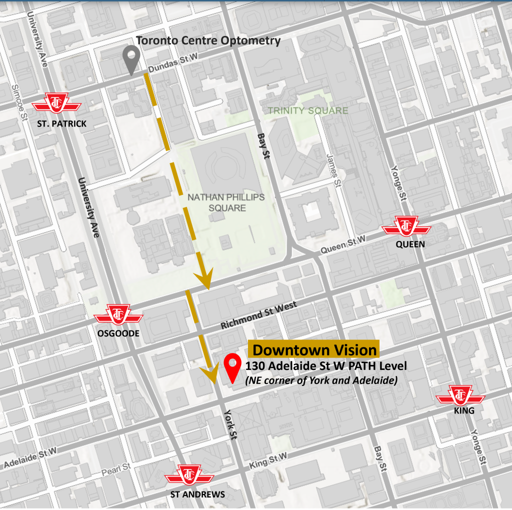 Our clinic, Downtown Vision is conveniently close by – just a 10 minutes walk away from the old location, and near Osgoode Subway Station. We also have a paid parking garage available, just off York St.